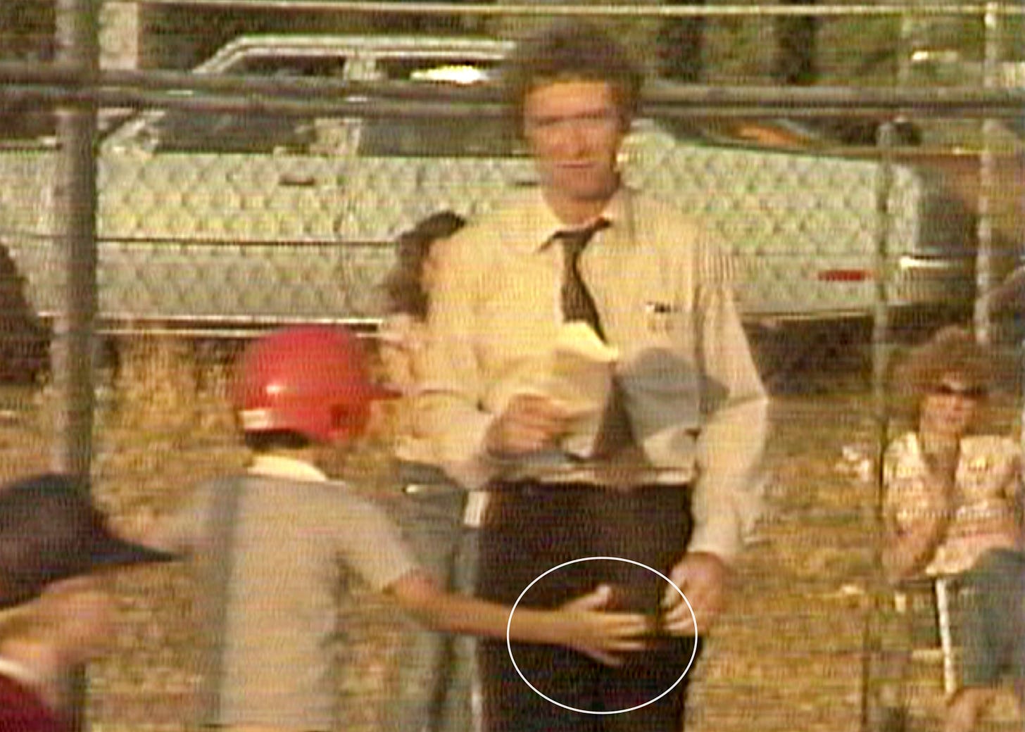 Matt was running the bases just as the live segment began and crossed paths with me near home plate. While speaking to the TV audience, I stuck to our plan and tried to ignore his presence, but little Matthew, loving son that he is, couldn’t pass up the chance to give his father a quick hug around the waist. Due to our size difference, his arms and one hand made contact just below my belt.
